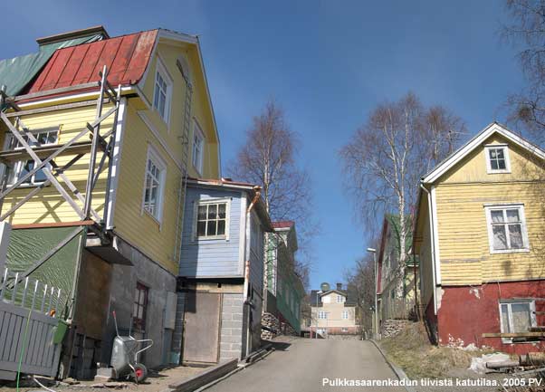 - Todettiin, että alueen pohjoislaidassa on rivitalo, joka ei sovi arvoalueen aluerajaukseen, kun taas puolestaan Pulkkasaarenkatu sen eteläpäädyn uudisrakennuksia lukuun ottamatta sopisi rakentamisen väljän luonteen ja hyvin säilyneiden vanhojen rakennusten ansiosta hyvin arvoalueeseen. Näin aluerajausta muuttamalla alueelle jäisi myös alue jolla Punainen tukkitie on aikanaan sijainnut