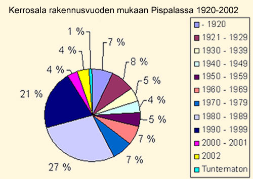 Kun tarkastellaan Pispalan rakentumista kerrosalan näkökulmasta, huomataan, että 1980- ja 90-luvuilla rakennettua kerrosalaa on lähes nelinkertaisesti (48% kokonaisalasta) verrattuna 1920- ja 30-luvuilla rakennettuun (13% kokonaisalasta). Toisen suuren rakennus ekspansion aikana, eli 1980- ja 1990-luvuilla rakennettuja rakennuksia Pispalan koko rakennuskannasta vuonna 2002 oli 35 %, eli lähes puolet enemmän kuin 20- ja 30-luvulla nousseita (24 %). Tämä suhde muuttuu jyrkemmäksi jokaisen vanhan rakennuksen purkamisen ja uuden rakentamisen myötä.