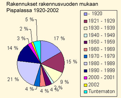 1920- ja 1930-luvuilla rakennettuja rakennuksia Pispalan koko rakennuskannasta oli vuonna 2002 24%. Ennen vuotta 1920 rakennettuja rakennuksia 17%. Ennen vuotta 1920 rakennetut ja vuosina 1921-1929 rakennetut rakennukset edustivat 32% Pispalan rakennuskannasta vuonna 2002.