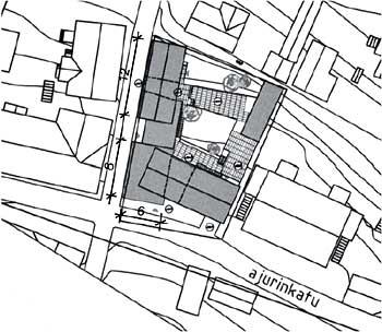 Rakennusoikeus jakaantuu päärakennukseen ja pieneen pihasaunarakennukseen. Päärakennus on polveileva ja sijoittuu katujen varteen. Päärakennus nivoutuu hyvin naapurirakennuksiin, mutta maisema ei aukea pihasta juuri ollenkaan. Tekijän tavoitteena onkin ollut suunnitella sulkeutuva ja intiimi sisäpiha. Työn ansiona on väljä ja intiimi piha sekä tehokas rakennusoikeuden käyttäminen sijoittamalla rakennukset kiinni rajaan.
